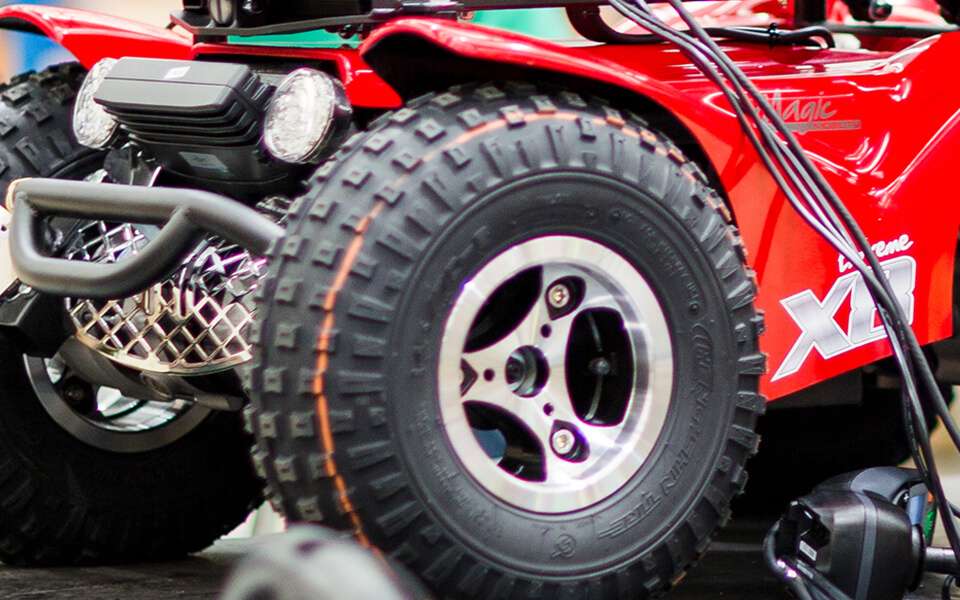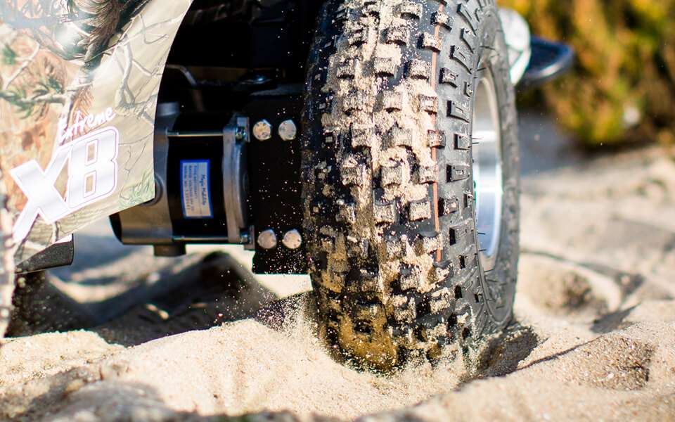 The Extreme X8 has an exceptionally smooth ride thanks to the smooth suspension that keep all four driving wheels on the ground. The low pressure off-road tyres gives the X8 increased grip and climbing ability, making this a truly all-terrain wheelchair!